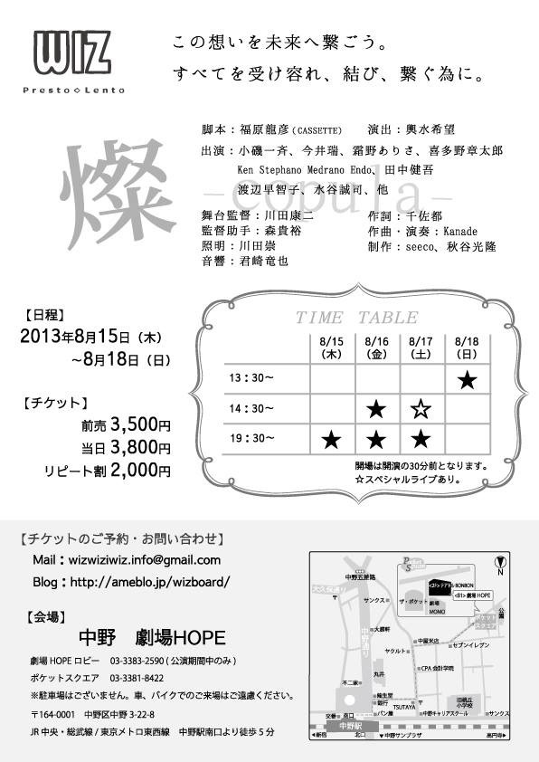 201306/16 裏面も完成! ブログ 0 芝居のチラシ、裏面も完成しました!ポータルサイトにも早速公開したら、少しずつ反響も出てきています!うわあああ。まだパーツずつのこのお芝居。どんなものになって、お客さんへ届けられるんだろう。ドキドキです。NOZOMI