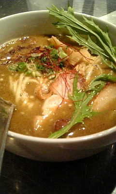 200808/26 カレー好き必見♪ ブログ 8 今日はらーめんを紹介☆でもカレー好きさん必見なのです。このラーメン、『グリーンカレーラーメン』なの♪味は、ココナッツ風味のグリーンカレーで後味がすごいしっかりした和風の出汁の味。麺は堅めの中太麺。チャーシューのかわりにチキンが入ってるの。カレーとラーメンが好きな人にはもってこいでは?!