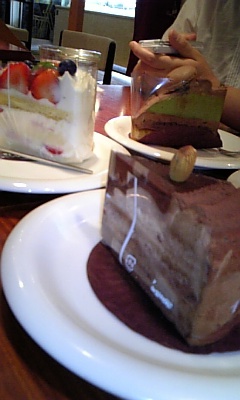 200808/17 別腹(笑) ブログ 4 甘いものは別腹です。アタシも甘いものは好きだけど、このケーキたちはちょっと圧巻★昨日、妹と友達とお茶したときの写真。ストロベリーショートケーキマロンと抹茶のムースのケーキ生チョコケーキ♪どれがお好み?ちなみにアタシが食べたのはどれでしょうか?!
